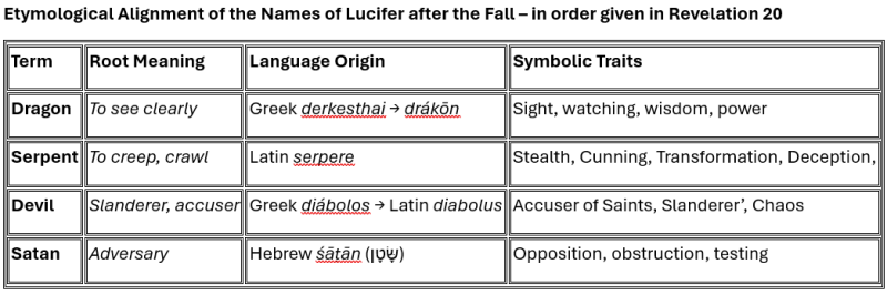 Notably, there is a principle in Biblical interpretation that states that “the Genius is in the Order”. In other words, the order of the Words or Names in the bible can often be very revealing. In this respect, the order of the names applied to our enemy in Revelation 20 is – Dragon, Serpent, Devil and Satan and this gives us some insight into how our enemy works:
